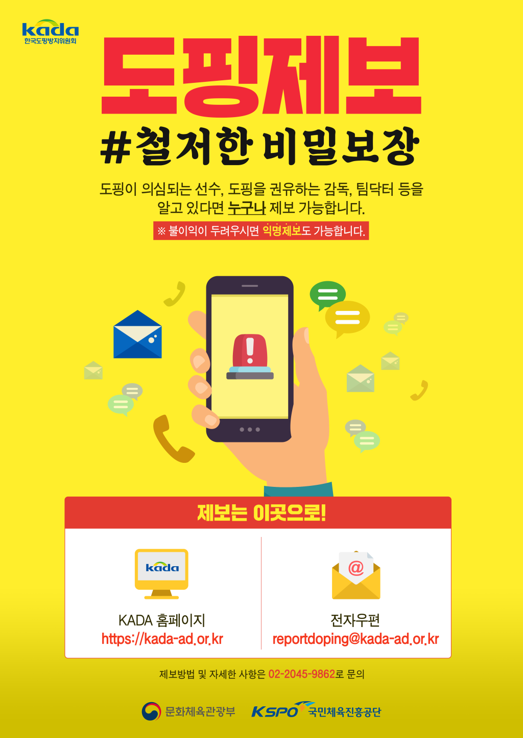 전자우편 제보(reportdoping@kada-ad.or.kr)가 가능합니다.
