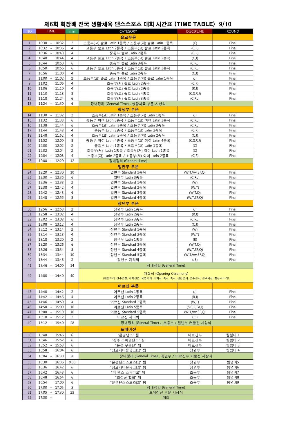 [타임테이블] 9월10일 회장배 생활체육 대회